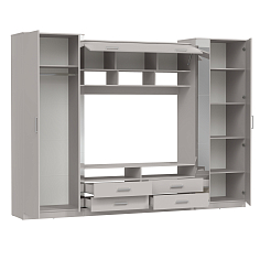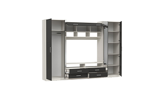 Шкаф взяли для гостиной. Смотрится стильно и современно, без лишних деталей. Экономит пространство и в тоже время очень вместительный: есть выдвижные ящики внизу и шкафы с распашными дверцами для одежды справа и слева. Цена вполне демократичная. Оплачивали наличными при получении, но можно было и онлайн заранее на сайте. С доставкой проблем не было.